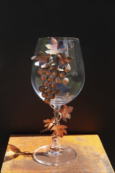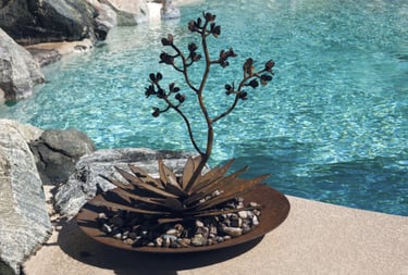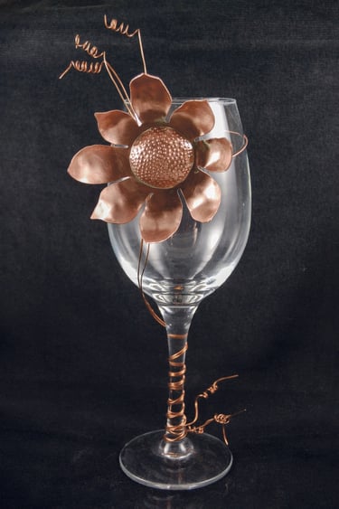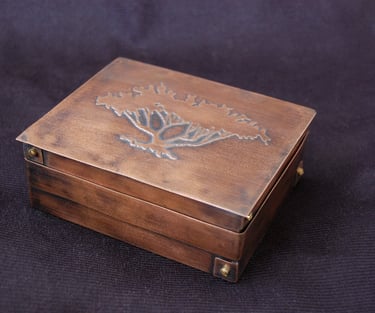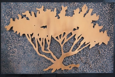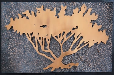 Hand sawn copper Mesquite tree set on hammered copper and patinaed background.