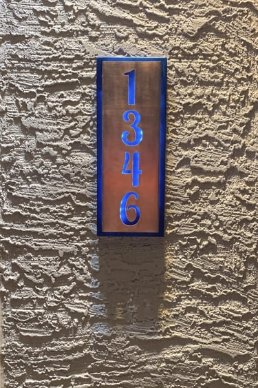 Stained and sealed steel base with copper number plate. Low voltage LED strip lights.