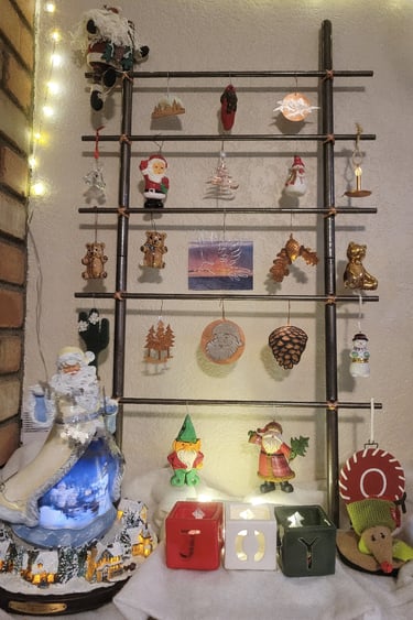 Steel ladder fabricated with descending height steps. Textured paint with copper accent at step junctions.