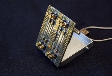 Platinum wires mounted in threaded brass settings and secured with brass screws on a Sterling Silver base.