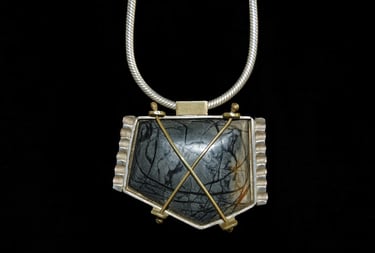 Irregular shaped Picasso Marble stone set in Sterling Silver frame and held with crossed brass wire accents