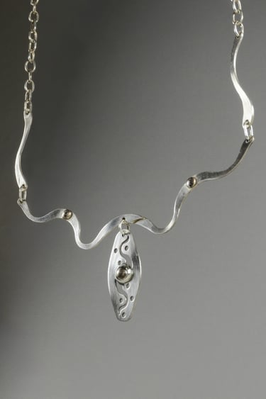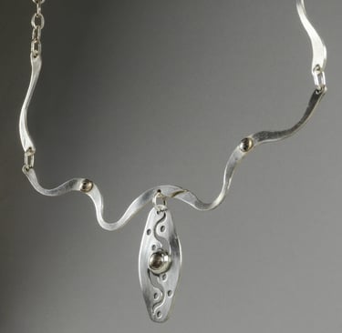 Sterling Silver pendent with pierced curve design and domed Mokume Gane accent. Unique chain features curvy silver links with domed Mokume Gane accents and a hand fabricated silver wire chain